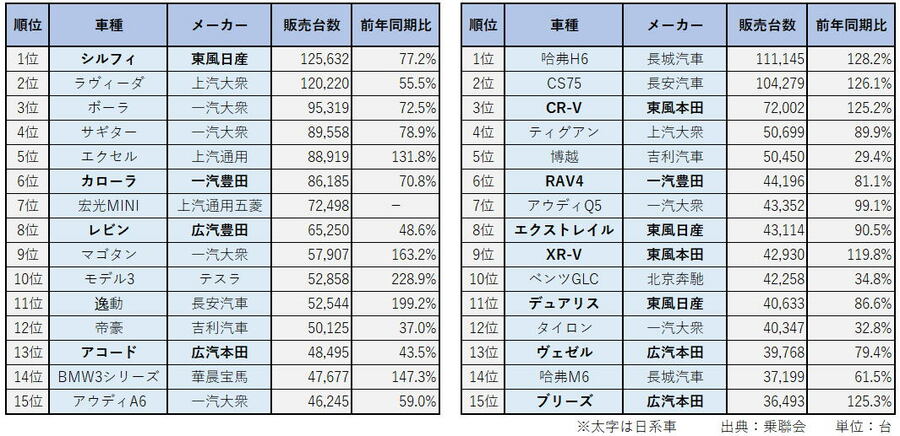 左:中国におけるセダン販売台数の順位(2021年1~3月)/右:中国におけるSUV販売台数の順位(2021年1~3月、「前年同期比」は増分を示す)