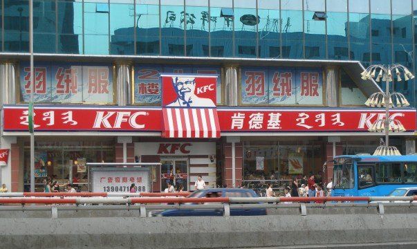 2014年ごろに撮影された内モンゴル自治区の省都フフホトにあるケンタッキー・フライド・チキンの店舗。看板や道路標識は標準中国語とモンゴル文字の両方で表記することが義務付けられているという(Colipon at en.wikipedia, CC BY-SA 3.0 , ウィキメディア・コモンズ経由で)