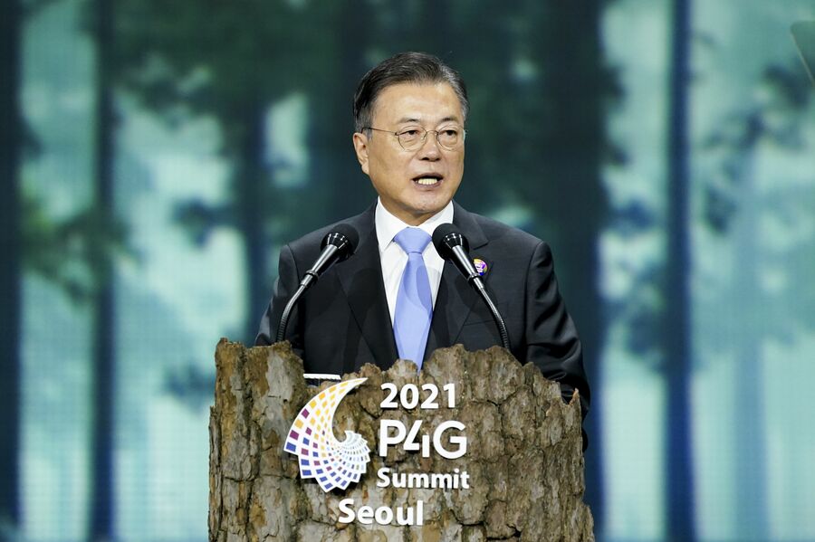 5月30日、ソウルで開催された環境問題を扱う国際会議「P4Gサミット」での文在寅大統領(写真:YONHAP NEWS/アフロ)