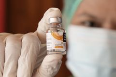 6月21日、ジャカルタの集団ワクチン接種会場で、シノバック社製ワクチンのバイアルを示す医療従事者(写真:AP/アフロ)