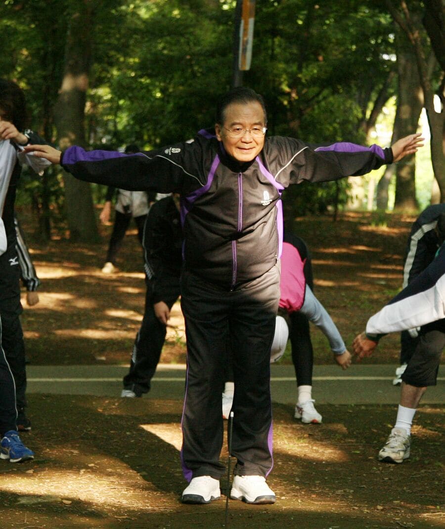 東京代々木公園でラジオ体操をする温家宝前首相(写真:橋本 昇)