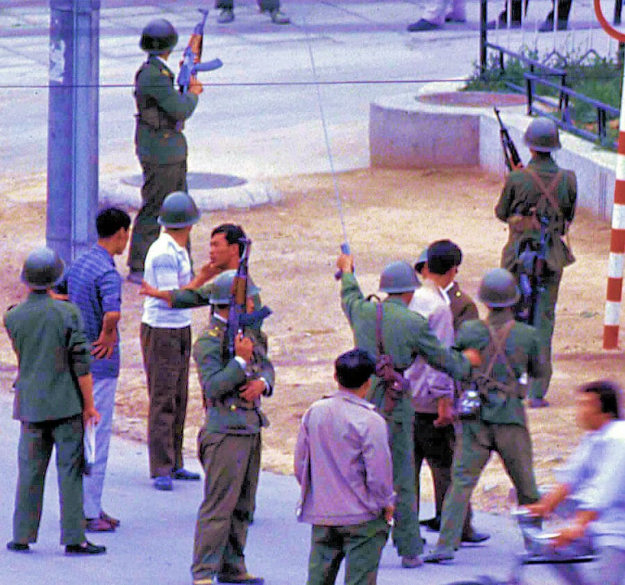 学生と思われる男を連行する兵士(写真:橋本 昇)