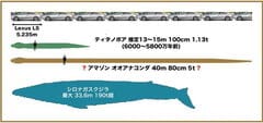 「Lexus LS」と比較すると40mの大蛇はLexus LSを7台半並べたのに匹敵、ティタノボアの約3倍だ。(作図構成・山根一眞、出展:Lexus LS写真はレクサス専用サイトから引用、シロナガスクジラと人物はフリー画像)