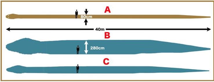 A・「40m、80cm、5t」の大蛇。B・ティタノボアのサイズを元に40mに拡大したアマゾンの大蛇。C・それを半分以下にスリム化。半分の「太さ」としても胴体の太さと人の身長を比べると、「40m、80cm、5t」の写真に写っている人のサイズは、はるかに小さくなければおかしい。(作図・山根一眞)