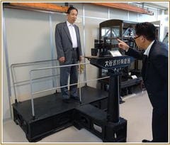 東洋計量史資料館所蔵の「牛馬掛秤」に載って説明する土田泰秀館長。大正13年(1924)から昭和45年(1970)年まで使用されていたもので、最大で1200kgまで計量できる。(撮影・山根一眞)