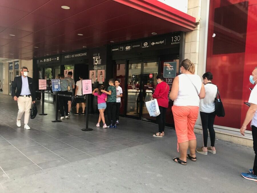 衛生パスのQRコードチェックのため、大型施設に前には人の列。待ちながら、携帯のQRコードを探す