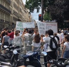 パリでのデモのシーン。プラカードには「我ら思う、故に従わない」。デカルトの「我思う、故にわれあり」をもじったものだ。思考する力がちゃんとがあるがゆえに、上の命令には簡単には従わないと考える