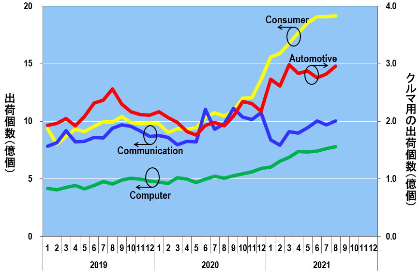 図1 特定用途向けロジック半導体(ASIC)の出荷個数(~2021年8月)