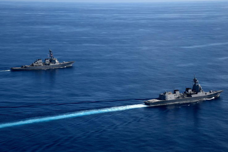 2021年10月19~24日に南シナ海で共同訓練を実施した海自の護衛艦「しらぬい」(右)と米海軍駆逐艦「ヒギンズ」(資料写真、出所:海上自衛隊ホームページ)