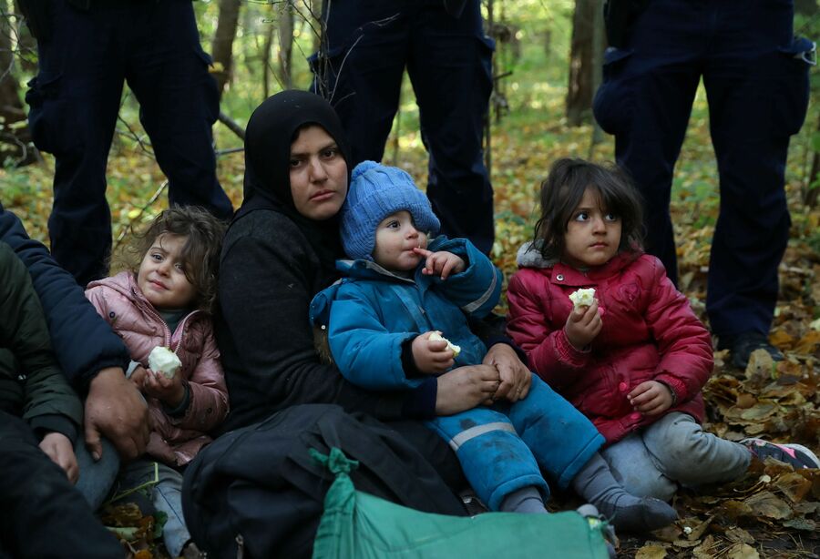 ベラルーシ経由でポーランドに入国したイラク人女性。小さな子供を連れている(写真:ロイター/アフロ)