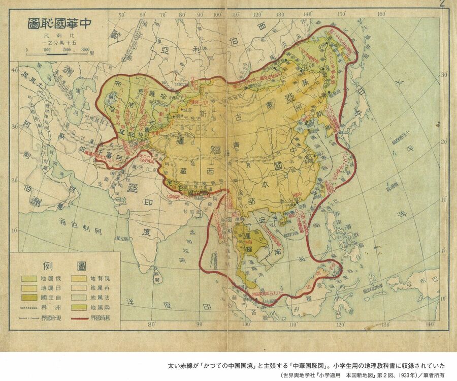 勘違いと願望から「創造された」中国・南シナ海領有権の根拠 中国による埋め立てが進む南沙諸島にある暗礁「スビ礁」(2015年5月撮影。United States Navy, Public domain, ウィキメディア・コモンズ経由で) (画像1/4) 「中華国恥図」の実物(譚璐美著『中国「国恥地図」の謎を解く』〈新潮新書〉カラー口絵より) 拡大画像表示 (画像2/4) 『中国「国恥地図」の謎を解く』(譚璐美著、新潮新書) (画像3/4) 白眉初による「海彊南展後之中国全図」(『中等学校適用 中華建設新図』所収、北平建設図書館刊行、1936年) 拡大画像表示 (画像4/4) 勘違いと願望から「創造された」中国・南シナ海領有権の根拠 この写真の記事を読む