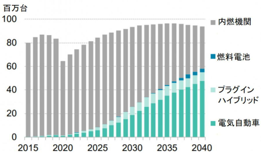 脱炭素化の決め手は電気自動車ではない (画像1/3) 図1 世界の年間乗用車販売台数の予測(ブルームバーグ) (画像2/3) 図2 移動サービスの普及予測(アメリカ運輸省) 拡大画像表示 (画像3/3) 脱炭素化の決め手は電気自動車ではない この写真の記事を読む