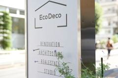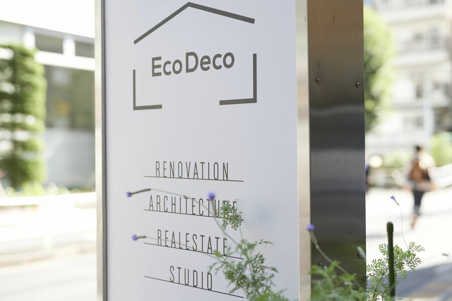 谷島さんの会社Style&Decoのビルの前で。中古物件探しからリノベーションまでをワンストップで手がける「EcoDeco」がメイン事業。
