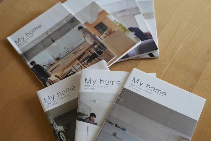 谷島さんの会社で手がけたリノベーション物件を紹介するカタログ。それぞれの生活動線や好みにフィットした個性豊かな住宅が並ぶ。