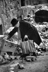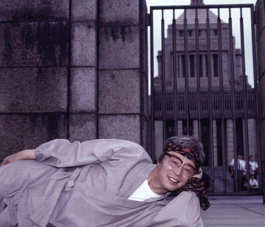 国会議事堂前でゴロリと寝転んでポーズを決める新右翼の大物・野村秋介(写真:橋本 昇)