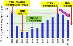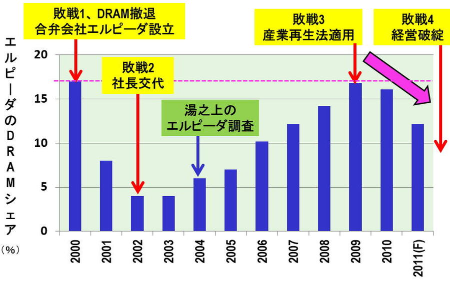 まだそんなことを言っているのか!間違いだらけの「エルピーダ破綻の原因」 (写真:ロイター/アフロ) (画像1/7) 2012年2月27日、エルピーダメモリが会社更生法の適用を東京地裁に申請し受理された。同日、記者会見する坂本幸雄社長(写真:ロイター/アフロ) (画像2/7) 図1 エルピーダの売上高シェアの推移 (出所:ガートナーおよびiSuppliのデータなどを基に筆者作成) (画像3/7) 図2 三菱電機からエルピーダに出向した社員へのインタビュー (2004年5月11日、湯之上の調査による) (画像4/7) 図3 エルピーダからサムスンへ転職したX氏へのインタビュー (2004年9月22日の湯之上の調査による) (画像5/7) 図4 エルピーダの営業利益の推移 (出所:エルピーダの営業利益は同社の決算報告書等のデータを基にしている) (画像6/7) 図5 合弁、国プロ、コンソーシアム、全部失敗した (出所:半導体シェアのデータはガートナーおよび一部筆者予測) (画像7/7) まだそんなことを言っているのか!間違いだらけの「エルピーダ破綻の原因」 この写真の記事を読む