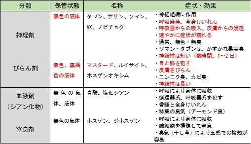 出典:陸自特殊武器防護教範およびその他の資料から作成、*サリンは無色・無臭。煙など出ない。*ガスが蒸発して拡散するのであって音を出して吹き出すことはない
