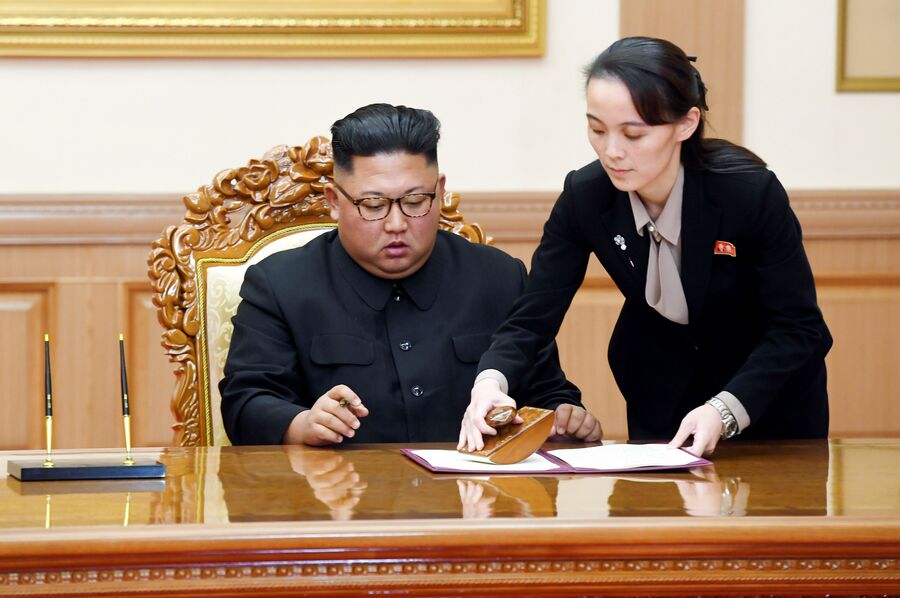 2018年9月19日、平壌で開催された韓国の文在寅大統領との間で開かれた南北首脳会談後、平壌共同宣言に署名する金正恩総書記と、それをサポートする妹の金与正氏(写真:代表撮影/Pyeongyang Press Corps/Lee Jae-Won/アフロ)