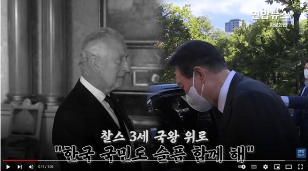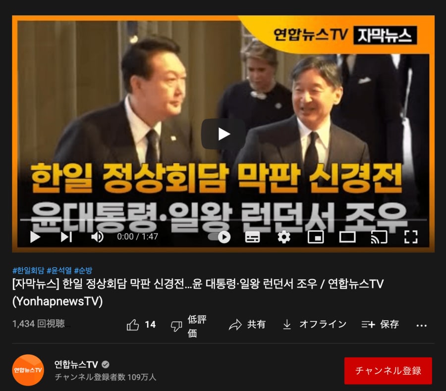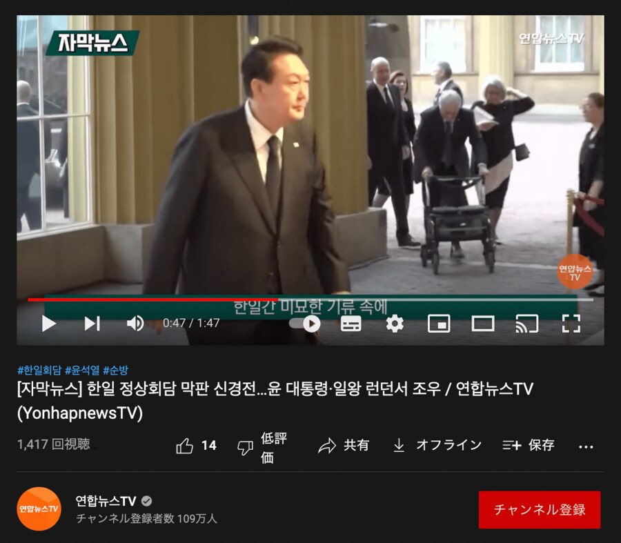 聯合ニュースのYouTubeチャンネル冒頭場面の画像キャプチャ。天皇陛下が尹大統領に話しかけているように見える(出所:https://www.youtube.com/watch?v=3yDMAGR3I9s、以下同)