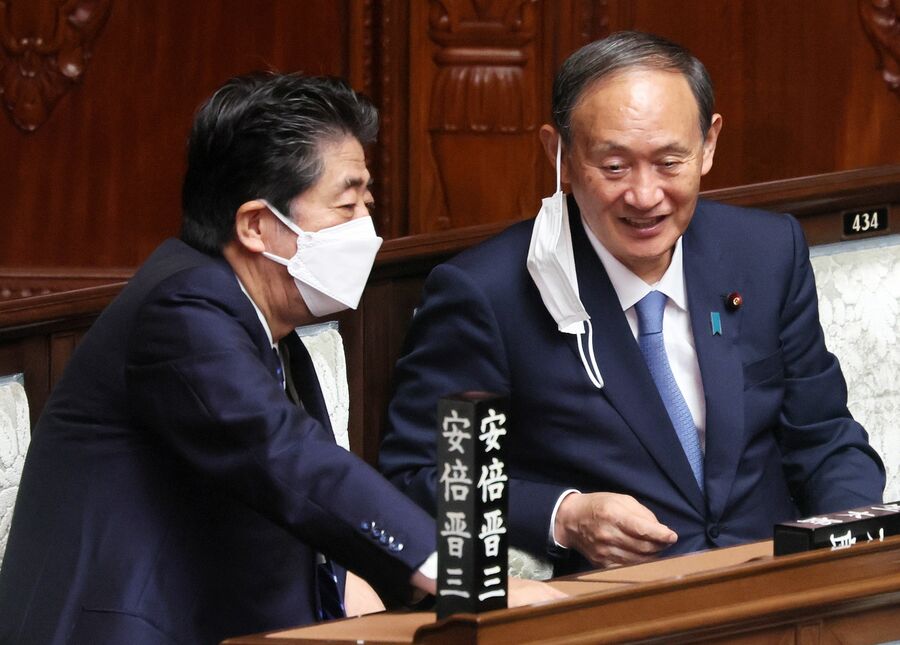 今年6月22日、衆議院の本会議場で安倍元首相に笑顔で語り掛ける菅前首相(写真:つのだよしお/アフロ)