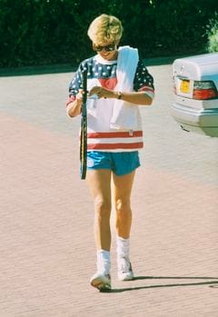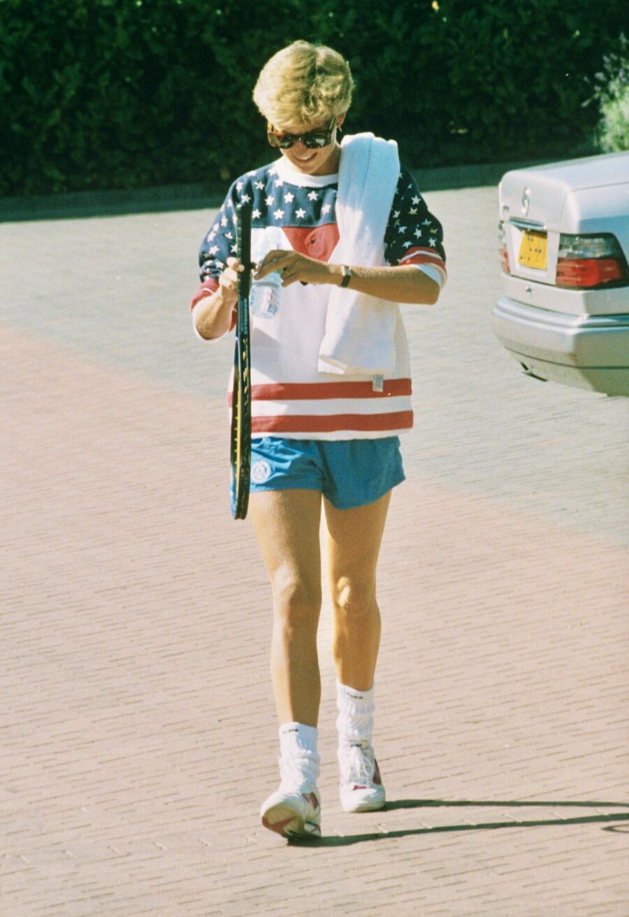1994年のダイアナ妃。アメリカンな星条旗柄のオーバーサイズのシャツとショートパンツは元祖アスレジャースタイル 写真=REX/アフロ