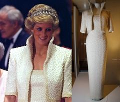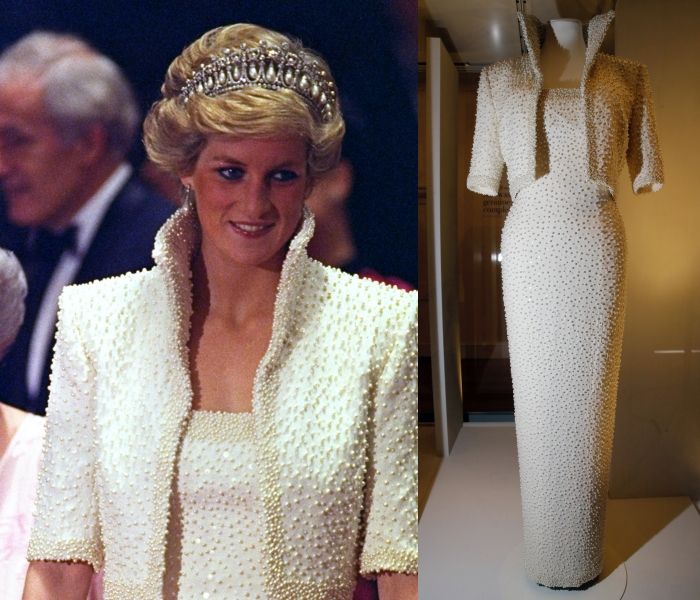 1989年、香港で着用したドレスとボレロのアンサンブルにはパールがぎっしり装飾されている。右の写真は没後20年の2017年にケンジントン宮殿で開催されたダイアナ妃の衣裳展より 写真=AP/アフロ