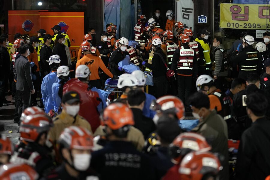10月30日、ソウル市の繁華街・梨泰院で発生した集団圧死事故の現場で負傷者の救助にあたる救急隊員たち(写真:AP/アフロ)