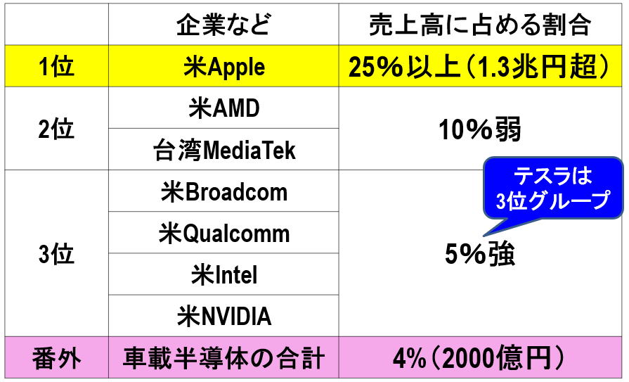 4nm/5nm半導体を大量発注、「半導体のバカの壁」を突破したテスラ テスラがシンガポールに開設したサービスセンター(資料写真、2022年7月16日、写真:ロイター/アフロ) (画像1/8) 図1 2021年のクルマメーカー別のEV販売台数トップ20 出所:36Kr Japnaのデータ (画像2/8) 図2 自動運転のレベル 出所:内閣府、国交省などの資料を基に筆者作成 (画像3/8) 図3 自動運転車に搭載される各種の半導体 (画像4/8) 図4 完全自動運転のシステムの概念 (画像5/8) 図5 TSMCの最先端テクノロジー・ノードのロードマップ 出所:WikiChip Fuse,“N3E Replaces N3; Comes In Many Flavors”, September 4, 2022 (画像6/8) 図6 TSMCの売上高に占める企業別シェア(2022年は勝手な予測) 出所:2019~2021年のデータは「Gigazine」(2021年3月21日、元データの出所はThe Information Network)、2022年はデータが無いのでテスラ以外は2021年と同じと仮定した (画像7/8) 図7 TSMCの売上高5兆円に占める割合(2020年) 出所:日経新聞(2021年4月16日)のデータに筆者が加筆 (画像8/8) 4nm/5nm半導体を大量発注、「半導体のバカの壁」を突破したテスラ この写真の記事を読む