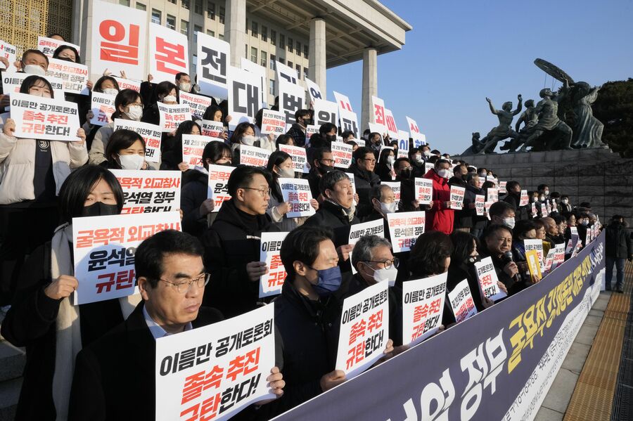 1月12日、この日行われる徴用工問題に関する公開討論会に反対するために集まった市民団体のメンバーや野党議員たち。尹錫悦政権を批判し、日本企業による謝罪と賠償をあらためて強調した(写真:AP/アフロ)