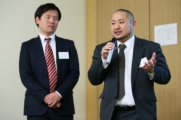 日本オリンピック委員会(JOC)が推進する現役トップアスリートの就業マッチング制度「アスナビ」によるパラアスリート採用企業交流会で話す初瀬氏(右)(写真:アフロスポーツ)