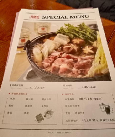PRONTO・上海店のすき焼きメニュー(筆者撮影)
