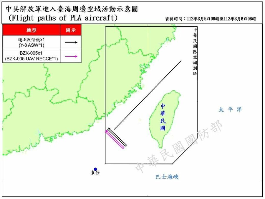 台湾国防部が公表した中国軍機接近航跡図のうち無人機が加わっていた日を抽出したもの。機型表記の「BZK-005」は無人偵察機、「CH-4」「TB-001」は無人偵察攻撃機、「J-10」「J-11」「J-16」「SU-30」は戦闘機、「Y-8 ASW」は対潜哨戒機、「Y-8 RECCE」は偵察機(以下、同)