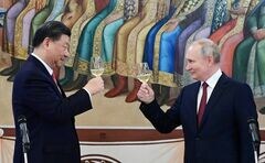 3月21日、モスクワを訪問した習近平主席を歓迎するレセプションの一コマ。乾杯するプーチン大統領と習近平主席(写真:ロイター/アフロ)