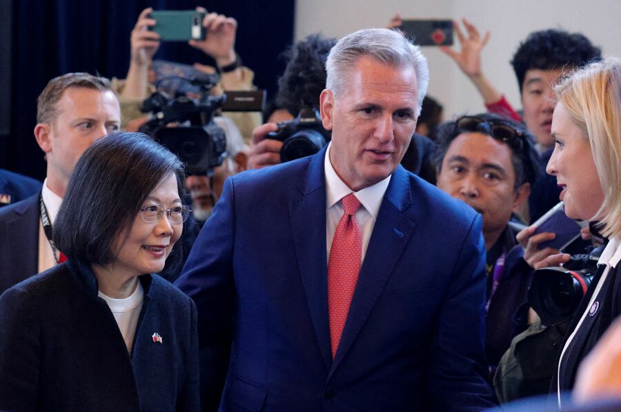 会談した台湾の蔡英文総統とマッカーシー米下院議長(2023年4月5日、写真:ロイター/アフロ)