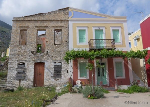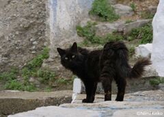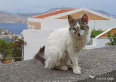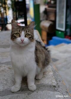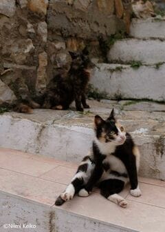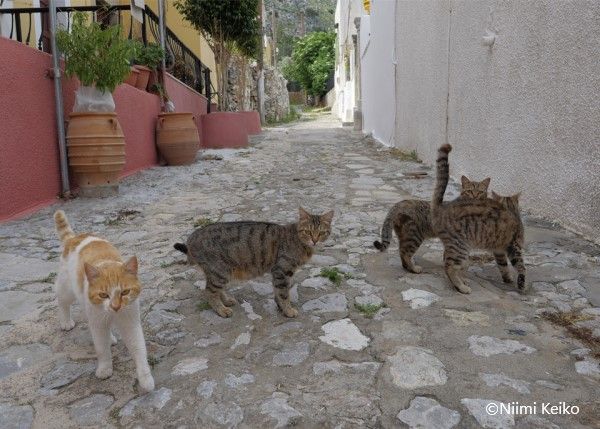屋根の上から通りを見つめる犬、視線の先には疾走する猫が