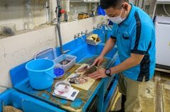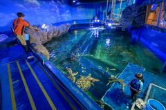 秘密のバックヤードへ!「しながわ水族館」の「裏側潜入ツアー」 「しながわ水族館」入口に到着! (画像1/20) 「トンネル水槽」の正面。長さは22m。深さは3mで水量は500トン!ガラスの厚みは10.5cmある。トンネルを通りながら、いろいろな生き物を撮影できるのが魅力だ。「しながわ水族館」で一番人気のスポット! (画像2/20) 「トンネル水槽」を上から見たところ。現在、エサやり中。水槽内にはアオウミガメ、ナポレオンフィッシュ、ホシエイ・マダラトビエイなど約60種・約260点(7月19日以降は約300点)の生き物がいる。50~60kgあるアオウミガメを間近で見ると、すごい迫力!優雅に長時間泳いでいるのに驚く (画像3/20) ホシエイとアオウミガメの豪華なツーショット!水族館はなぜ、ずっと見ていても飽きないのだろうか。水槽を見ていると、自分が水の中にいるような、浮遊感を感じる (画像4/20) 体長約2.5mのシロワニ。悠然と泳ぐ姿に圧倒される。水槽の下には抜けた歯が落ちているので、必見だ。ちなみに抜けた歯はグッズとして販売することも! (画像5/20) イルカはとても好奇心旺盛で写真を撮影していると、寄って来る。ショー以外の時間は気ままに泳いでいる (画像6/20) つぶらな瞳が愛らしいコツメカワウソ。以前は乱獲され、激減してしまったという。水族館には「生き物を保護する役割」もあるのだ (画像7/20) 「裏側潜入ツアー」のガイドは魚類か海獣(イルカ・アシカ・アザラシ)の担当者が日替わりで担当。今日の担当は魚類の飼育員・瀬川裕啓(やすひろ)さん(背後にいるのはシロワニ) (画像8/20) 身を守るために群れで生きるマイワシ。「集団の美」を感じさせる (画像9/20) ウェットスーツのようなものが目に飛び込んでくる。瀬川さんに尋ねると、「これはウェーダーといい、カモ担当の飼育員が今朝使用したもの」「使用する頻度が高いので入口にある」と回答。普段では見れない、飼育員の方々の日常を垣間見れるのがうれしい (画像10/20) これは、魚の水槽に使う水をきれいにするろ過装置。一見ハイテクな装置と思いきや、実は、ろ過に使用するのは「砂」なんだとか! (画像11/20) 魚に合わせて水温を調節するプレート式水温調整器&無数の配管が無機質な感じでカッコいい!配管は温水・冷水・ブライン(低温水)の3種類がある (画像12/20) 1階の展示「品川と海」の中だ!ガラスの向こう側にはお客さんが見える。水族館で「見られる立場」になるのは、人生で初めて。とっても不思議な感覚だ (画像13/20) すっごく軽い!「瀬川さんに騙された!!!」 (画像14/20) メンテナンスや掃除の観点から、石やヒトデ、貝もFRP(繊維強化プラスチック)製だ (画像15/20) 「品川と海」の正面。ビル群には「実際には、品川にいない企業も入っている」と聞き、「水族館の展示にも大人の事情が……」と、しみじみ (画像16/20) 料理人にも劣らない、華麗な技で魚をさばく飼育員の方々 (画像17/20) 冷凍のアサリやエビ、アジ、サンマ、サバ、マイワシ、ワカサギ、カラフトシシャモなど多数のエサが並ぶ。手前にはアルテミア ノープリウス幼生。金のフタがついた瓶=卵だ。三角フラスコには卵からふ化させたアルテミア ノープリウス幼生が入っているので、オレンジ色に見える。このカラカラに乾燥した卵を海水に入れ、ひと晩経つと泳ぎ回るアルテミア・ノープリウス幼生が産まれてくるそう! (画像18/20) カラフトシシャモのメス。卵があるので身に栄養がないため、オスのみエサに使う。「エサには(卵よりも)身が大切」と瀬川さん。水槽が濁ってしまうのも避ける理由だ。カラフトシシャモは尻ビレの大きさでオスメスを見分けている(大きい方がオス) (画像19/20) 喉が冷気に覆われて息ができない。身体よりも先に喉で冷気を感じるとは!ドアを数秒開けただけで、冷凍庫内の温度が4~5℃も上がり、びっくり! (画像20/20) 秘密のバックヤードへ!「しながわ水族館」の「裏側潜入ツアー」 この写真の記事を読む
