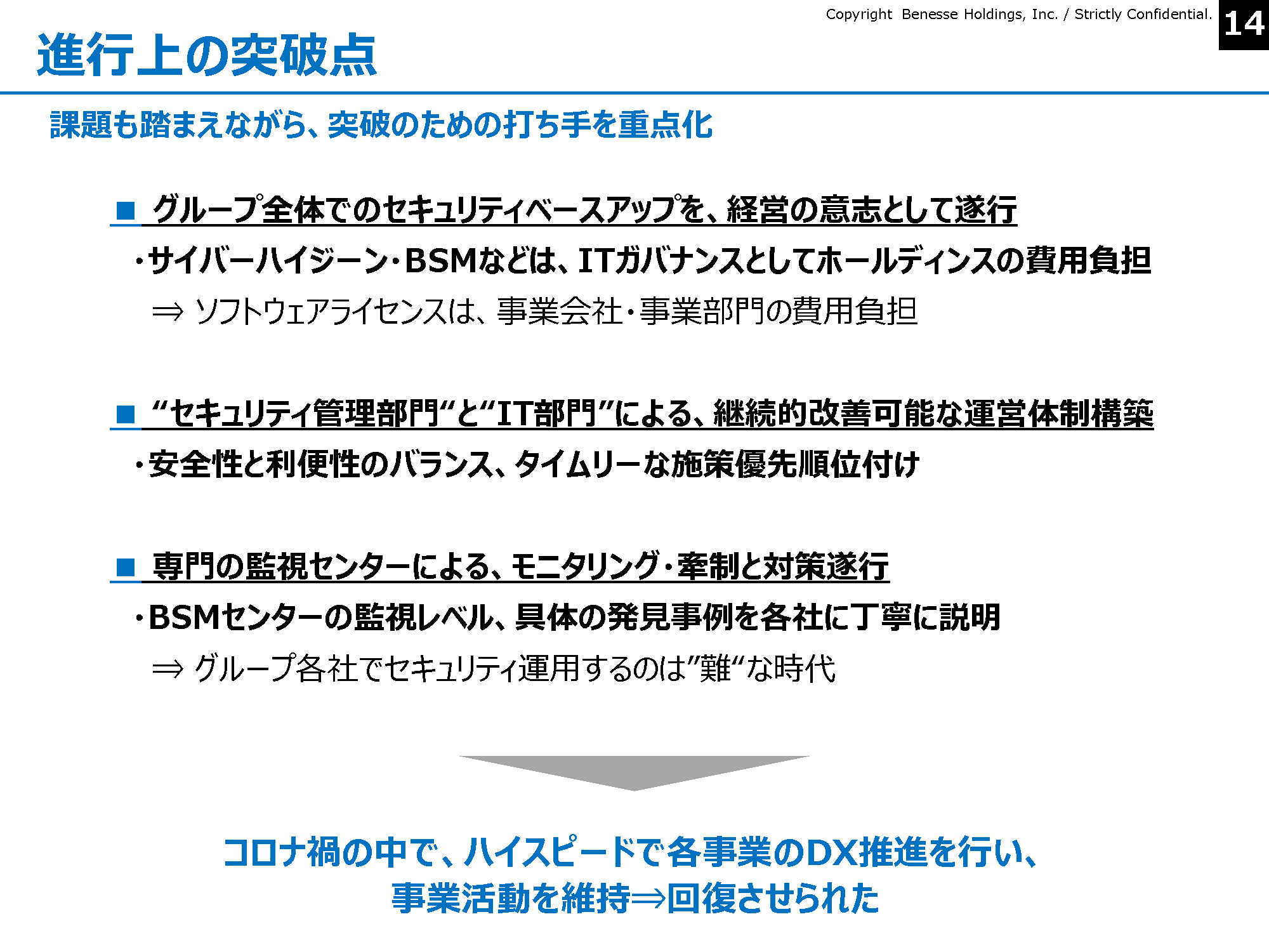 「攻めるために守る」苦難を乗り越えたベネッセのセキュリティ対策の“いま” (画像1/4) 橋本 英知/ベネッセホールディングス 専務執行役員 CDXO 兼 Digital Innovation Partners本部長 ダイレクトメールを中心とした、各種メディアによるセールスプロモーションツールの企画・制作に携わる。新商品開発、新規事業開発、経営企画などを経験後、CMO補佐として、マーケティング戦略・ブランドコミュニケーション・情報基盤・組織人事・コンプライアンス・業績管理などに広く従事。こどもちゃれんじ事業、英語教育事業、進研ゼミ事業の責任者を経て、現在は、ホールディングスのデジタルトランスフォーメーションを担当。ダイレクトマーケティング、ブランド、CRM、デジタルトランスフォーメーション、人材開発領域での活動を中心に、講演・寄稿など多数。 ----- 好きな言葉:「無知の知」 お薦めの書籍:『サピエンス全史』(ユヴァル・ノア・ハラリ著) (画像2/4) 拡大画像表示 (画像3/4) 拡大画像表示 (画像4/4) 「攻めるために守る」苦難を乗り越えたベネッセのセキュリティ対策の“いま” この写真の記事を読む