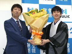 2020年7月16日、第91期棋聖戦5番勝負の第4局に勝ち、史上最年少でタイトルを獲得し、記念撮影に応じる藤井聡太棋聖(当時)と師匠の杉本昌隆八段 写真=時事