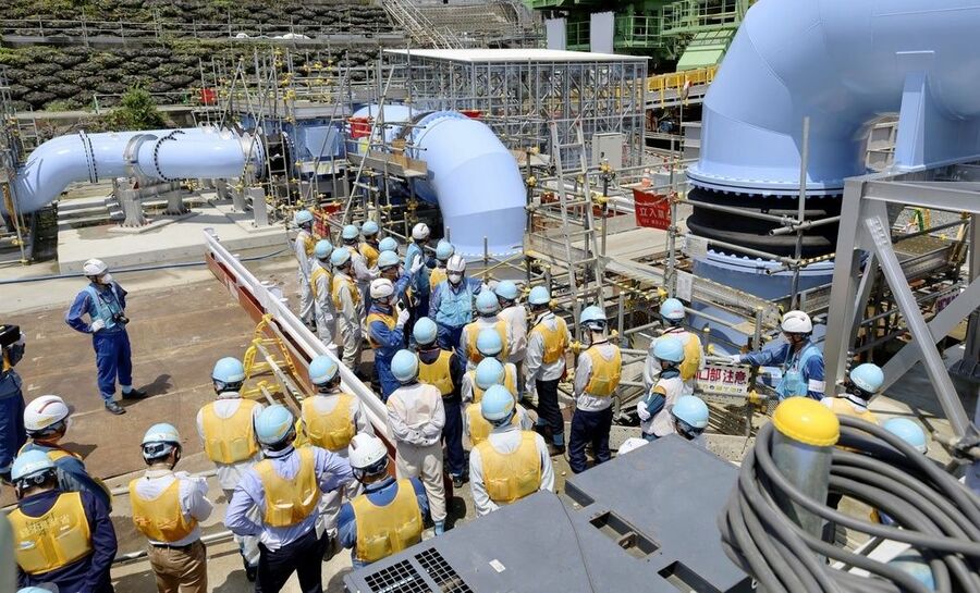 ALPS処理水の海洋放出設備。海洋放出に対して不必要なぐらい慎重に希釈化し、わざわざ放出用パイプを這わせて沖合まで伸ばして放出している(写真:共同通信社)
