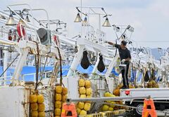 相馬市の漁港で船を整備する漁師。風評被害に対する不安を口にする(写真:共同通信社)
