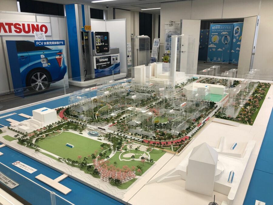 東京オリンピック・パラリンピック選手村地区「HARUMI FLAG」に関する模型。水素をパイプラインで地域内の燃料電池に供給する(写真:筆者撮影)