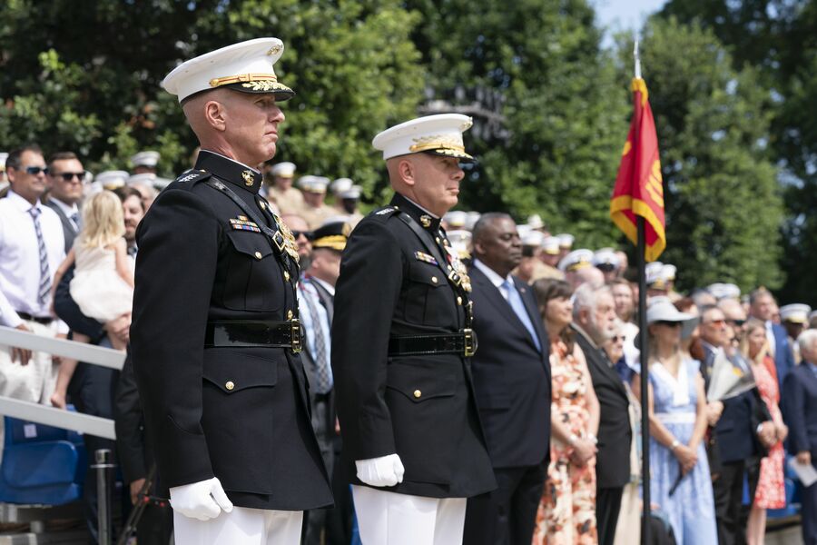 米軍トップ3人の後任指名が共和党から承認を得られていない。写真は海兵隊トップの退任式(写真:AP/アフロ)