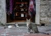 不良っぽい表情の猫が壁にもたれ、横着そうな姿勢で毛繕い