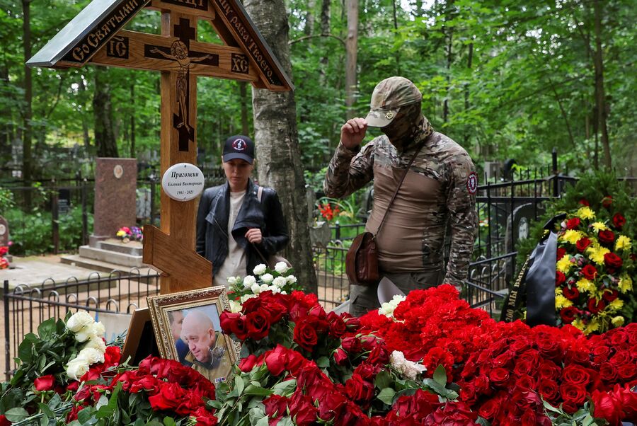 プリゴジンの非公開の葬儀が行われた翌8月30日、ポロホフスコエ墓地にあるプリゴジンの墓を何人もの人が訪れた。写真の迷彩柄の服を着た男性の肩にはワグネルのマークがついている(写真:ロイター/アフロ)