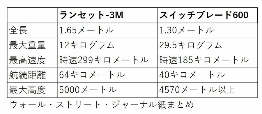 新型も続々、ウクライナの反攻を阻むロシアのカミカゼドローン「ランセット」 モスクワ郊外の軍事技術フォーラムで展示されたロシアの攻撃用無人機ランセット=2019年6月(写真:タス=共同) (画像1/5) ランセット-3Mとスイッチブレード600の性能比較 (画像2/5) 小型版のランセット-1(左)とランセット-3。ランセット-3Mはランセット-3をアップグレードしたものと見られる。弾頭もそれまでの3kgから5kgに大型化された(ザラ・エアログループのHPより) (画像3/5) ランセットを視察するプーチン大統領。左側で説明しているのがザハロフ氏(露大統領府のサイトより) (画像4/5) イズデリエ54とされる機体(ロシア国営放送「ロシア1」より) (画像5/5) 新型も続々、ウクライナの反攻を阻むロシアのカミカゼドローン「ランセット」 この写真の記事を読む