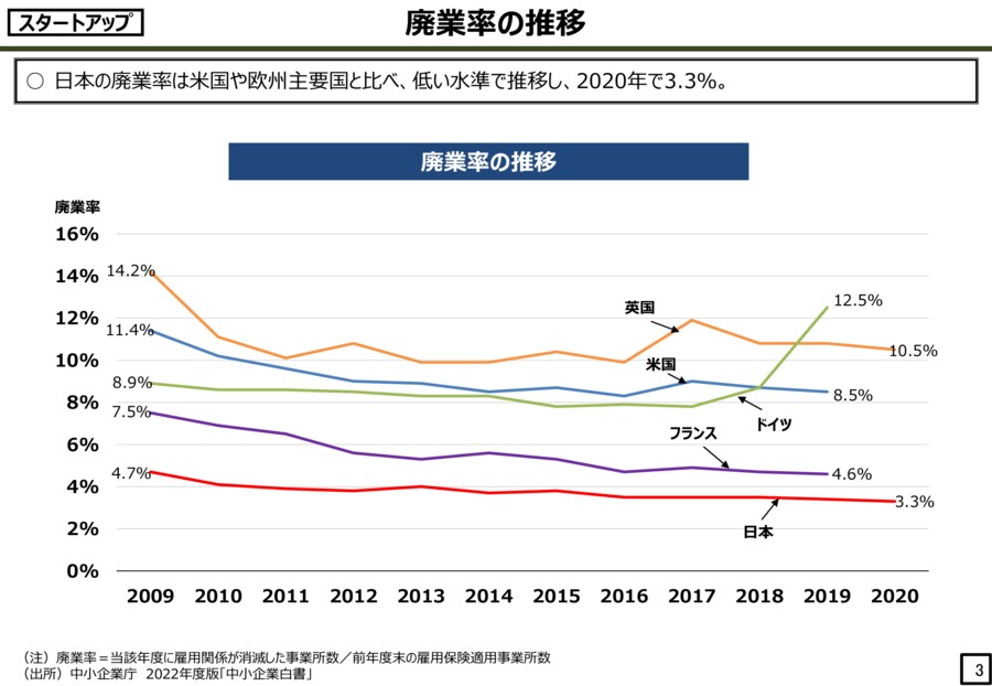 日本および主要国の開業率(上のグラフ)と廃業率(出所:「スタートアップに関する基礎資料集」内閣官房の新しい資本主義実現本部事務局)