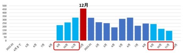 出典:ウクライナ軍参謀部発表の日々のミサイル発射数データを筆者が月ごとにまとめたもの。以下も同じ。当初の2022年2~8月までの6か月間は詳細なデータがない。たぶんウクライナ軍参謀部が、その時点での情報を整理できなかったからだと考えられる