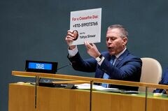 12月12日の国連総会で人道目的の休戦を求める決議が採択されたが、イスラエルの国連大使はハマスの事務所の電話番号が書かれたパネルを掲げ「本当の停戦を望むなら、ここに電話を」と訴えた(写真:ロイター/アフロ)