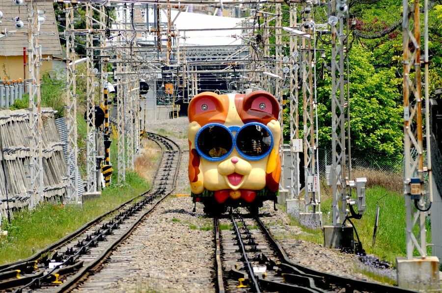 近鉄が運行する生駒ケーブルは生駒山中腹の宝山寺へとアクセスする参詣路線。車体はイヌとネコをモチーフにしている(筆者撮影)