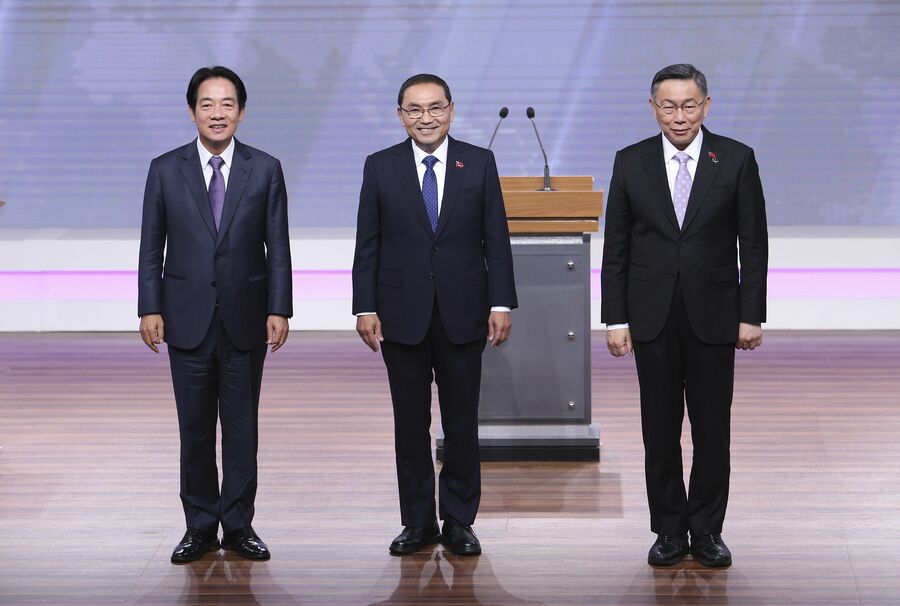 12月30日に台湾公共テレビで行われた討論会に出席した総統選の候補者たち。左から民進党の頼清徳氏、国民党の侯友宜氏、民衆党の柯文哲氏(写真:代表撮影/AP/アフロ)